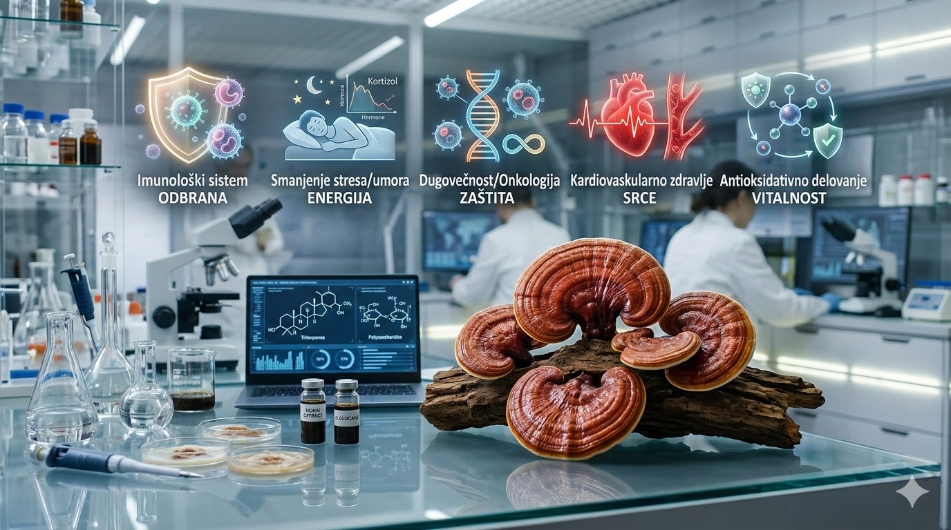 Poznata pod latinskim nazivom Ganoderma lucidum, Reishi medicinska gljiva nije običan suplement sa polica drogerija. Radi se o visoko kompleksnom biološkom entitetu koji u svom sastavu krije preko 400 bioaktivnih jedinjenja. Dokazi iz laboratorijskih analiza pokazuju da ključnu biološku aktivnost nose specifični makromolekuli: beta-glukani, triterpeni (ganoderične kiseline) i esencijalne aminokiseline.